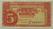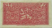 | Československá republika | Československá republika (1946 – 1953) | 5 korun | ![]() | ![]() | Bankovka byla tiknutá v Londýně. | 2 | Oběžná | Československá koruna |