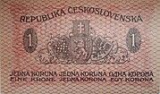 | Československá republika | Československá republika (1921 – 1939) | 1 koruna | ![]() | ![]() | Bankovku nazývali „státovka“. | 1 | Oběžná | Československá koruna |