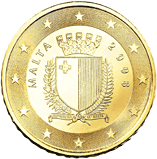 | 10 centů |  | Na minci v hodnotě 10 centů je zobrazen státní znak Malty, tvořený heraldickým štítem, který znázorňuje maltskou státní vlajku. V horní části znaku je zděná koruna, která symbolizuje opevnění Malty a městský stát. Štít je na levé straně lemován ratolestí olivovníku a na pravé straně ratolestí palmy, které jsou v dolní části svázány stuhou s nápisem „Repubblika ta´ Malta“ (Republika Malta). Jsou symbolem míru, který je s Maltou tradičně spojován. | 1 |