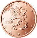 Finsko![]() | 5 centů | ![]() | Na minci v hodnotě 5 centů je zobrazen heraldický lev jako reprodukce díla, které vytvořil sochař Heikki Häiväoja. Heraldický lev byl v minulosti v různých obměnách vyobrazen na několika finských mincích, například na minci v hodnotě 1 marka v letech 1964 až 2001. | 1 | |