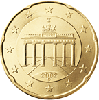 Německo![]() | 20 centů | ![]() | Na minci v hodnotě 20 centů je zobrazena Braniborská brána jako symbol rozdělení a následného znovusjednocení Německa. Perspektiva motivu, jehož autorem je Reinhard Heinsdorff, zdůrazňuje otevření brány a tím posiluje význam znovusjednocení Německa a Evropy. | 1 | |