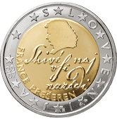 Slovinsko![]() | 2 eura | ![]() | Mince 2 eura nese portrét básníka Franceho Prešerena a nápis „Shivé naj vsi naródi“ (Bůh žehnej všem národům) - verš z jeho básně „Zdravljica“, která je součástí státní hymny. | 1 | |