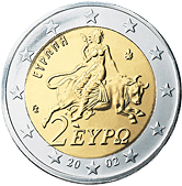 | 2 eura |  | Na minci 2 eura je zobrazena scéna z mozaiky ve Spartě (3. stol. n. l.) zobrazující Európu unášenou Diem, který na sebe vzal podobu býka. Európa je postava z řecké mytologie, po které byla pojmenována Evropa. | 1 |