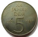 | Německo | Východní Německo (1949 – 1990) | 5 marek | ![]() | ![]() | 20. výročí založení NDR | 1 | Druhá série minci | Pamětní oběžná | Východoněmecká marka | |